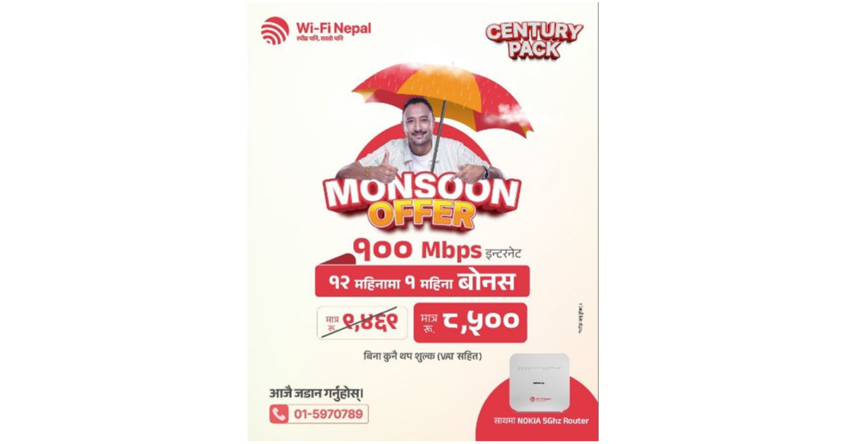 वाईफाई नेपालको अफर स् १०० एमबीपीएस इन्टरनेट साढे आठहजार रुपैयाँमा