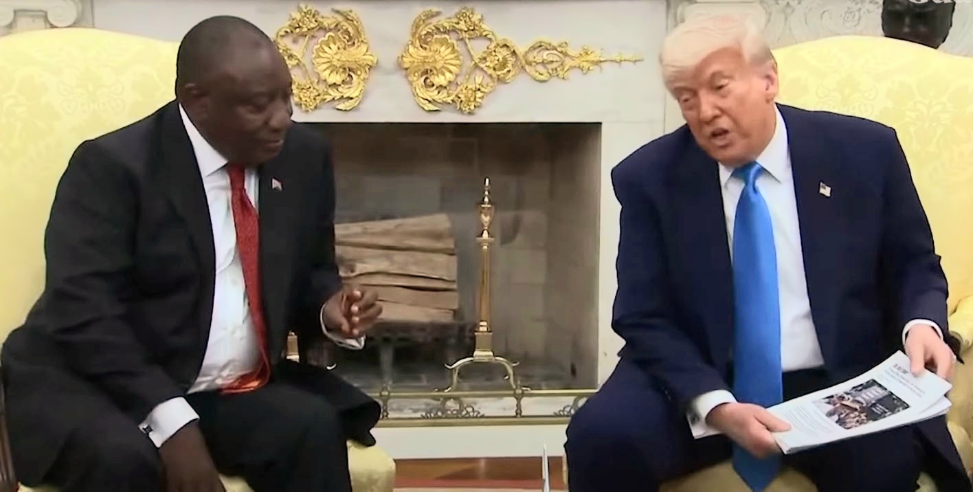 अमेरिकाको राष्ट्रपति कार्यालय ह्वाइट हाउसमा आयोजित रामापोसासहितको दक्षिण अफ्रिकी प्रतिनिधिमण्डलसँग भएको भेटमा एक भिडियो देखाउँदै उनीहरूलाई आक्रमणकारीका रूपमा प्रस्तुत गर्दै ट्रम्पले गोराहरूविरुद्ध नरसंहार भइरहेको छ भन्ने झुटो दाबी प्रमाणित गर्ने कोसिस गरेका थिए ।