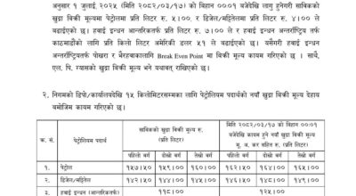 त्यस्तै, हवाई इन्धन आन्तरिकतर्फ प्रतिलिटर सात रुपैयाँ र अन्तर्राष्ट्रियतर्फ काठमाडौंका लागि प्रतिकिलोलिटर अमेरिकी डलर ५१ ले बढाइएको छ । भारतबाट इन्धनको मूल्य बढेर आएकाले यहाँ पनि सोहीअनुसार समायोजन गरिएको निगमले जनाएको छ ।