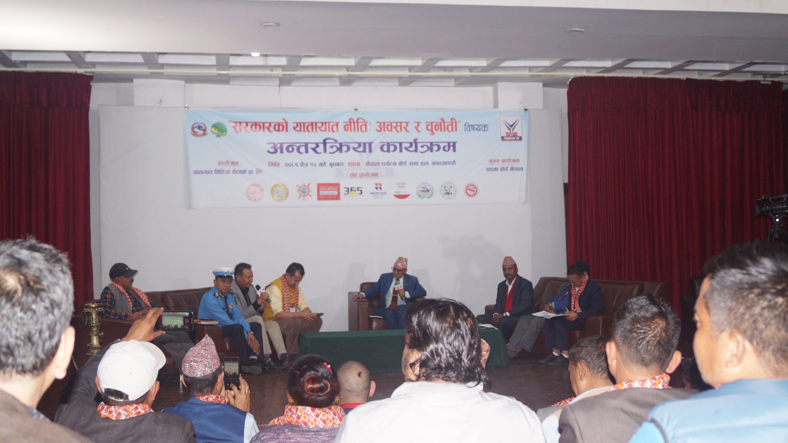 काठमाडाैँ । ‘सरकारको यातायात नीति : अवसर र चुनौती विषयक अन्तरक्रिया कार्यक्रम’ आज बुधबार अपरान्ह वृहत् रुपमा सम्पन्न भएको छ । यातायात मिडिया नेटवर्क प्रा.लि.को आयोजनाको भएको उक्त कार्यक्रम भृकुटी मण्डप काठमाडौँको नेपाल पर्यटन बोर्डमा सम्पन्न भएको हो । राष्ट्रिय गानबाट शुरुवात भएको उक्त कार्यक्रम अपरान्ह १ बजेदेखि शुरु भएको थियो भने प्रमुख अतिथिका रुपमा भौतिक पूर्वाधार तथा यातायात मन्त्री देबेन्द्र दाहालले पानसमा दीप प्रज्जवलित गर्नुहुँदै कार्यक्रमलाई अग्रता दिनुभएको थियो । यातायात मिडिया नेटवर्क प्रा.लि. का डाइरेक्टर रीना श्रेष्ठको सभापतित्वमा आयोजना भएको उक्त कार्यक्रममा विशेष अतिथीका रुपमा भौतिक पूर्वाधार तथा यातायात मन्त्रालयका सचिब केशब कुमार शर्मा तथा सडक बोर्ड नेपालका कार्यकारी निर्देशक गणेश बहादुर केसी लगायत अरु अतिथहिरुमा यातायात व्यवस्था विभागका डाइरेक्टर गणेश मान सिंह, नेपाल यातायात व्यवसायी राष्ट्रिय महासंघका अध्यक्ष विजय स्वाँर, लोकतान्त्रिक यातायात व्यवसायी संघका अध्यक्ष योगेन्द्रनाथ कर्माचार्य, नेपाल ट्रक यातायात व्यवसायी महासंघका अध्यक्ष हिरालाल श्रेष्ठ, सार्वजनिक यातायात केन्द्रिय महासंघका अध्यक्ष डोलनाथ खनाल, उपत्यका ट्राफिक एफएमका उमेश अवस्थी, काठमाडौँ महानगरका प्रतिनीधि नमराज ढकाल, नेपाल यातायात व्यवसायी राष्ट्रिय महासंघका बरिष्ठ उपाध्यक्ष हरिशरण केसी, पूर्व ए.आई.जी. भीम ढकाल, यातायात नेटवर्कका कृष्ण सागर कार्की, उपत्यका ट्राफिकका एसपी दीपक गिरी, मोडरेटर कृष्णानन्द भट्टराई तथा नेपाल यातायात मजदुर संघ केन्द्रिय महासचित्र जगन्नाथ गौतम लगायत समाजका प्रतिष्ठित व्यक्तित्वहरु, बुद्धीजीवि र विभिन्न संचार माध्यमका पत्रकारहरु सहभागी हुनुहुन्थ्यो ।