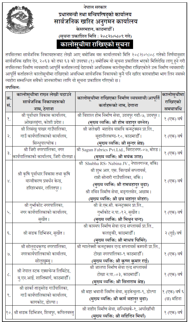 प्रधानमन्त्री तथा मन्त्रिपरिषद् कार्यालयअन्तर्गतको सार्वजनिक खरिद अनुगमन कार्यालयले समयमै काम सम्पन्न नगर्ने ११ वटा निर्माण कम्पनीलाई कालोसूचीमा राखेको हो ।