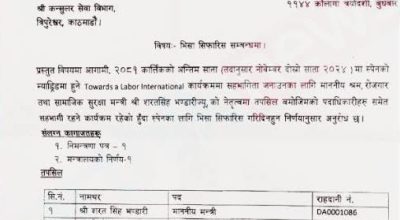 मन्त्रीले नै पत्नीलाई विदेश लैजाने भएपछि कर्मचारीहरु पनि के कम ? मन्त्रालयका सहसचिव सूर्यबहादुर खत्रीले पनि श्रीमती मिट्टु थापालाई भ्रमण टोलीमा घुसाए ।