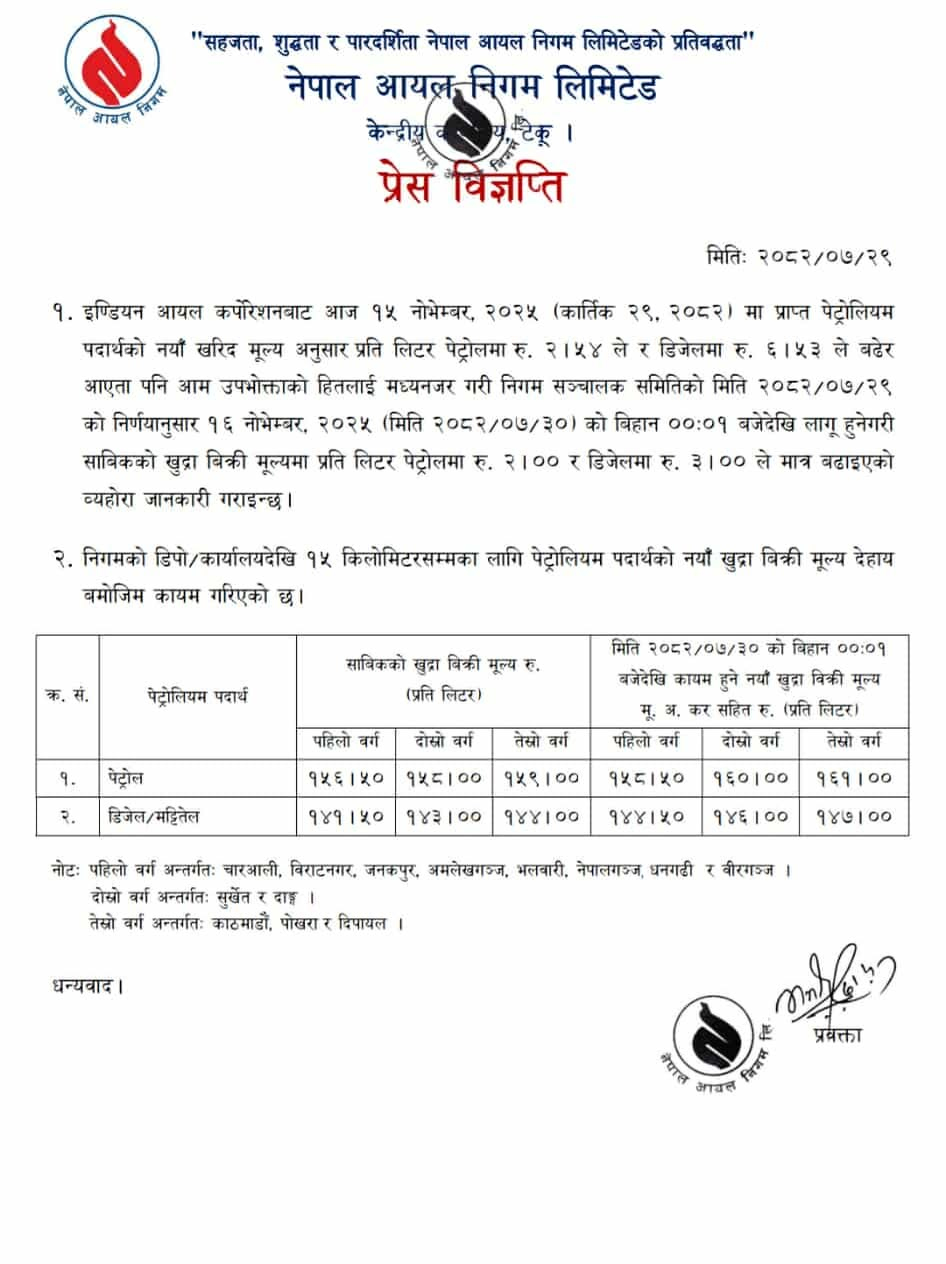 काठमाडौं । नेपाल आयल निगमले पेट्रोलियम पदार्थको मूल्य बढाएको छ । निगमले आइतबार ९कात्तिक ३०० बिहानदेखि लागु हुने गरी पेट्रोलको मूल्य लिटरमा दुई रुपैयाँले बढाएको छ । डिजेलको मूल्य लिटरमा तीन रुपैयाँले बढाइएको छ ।