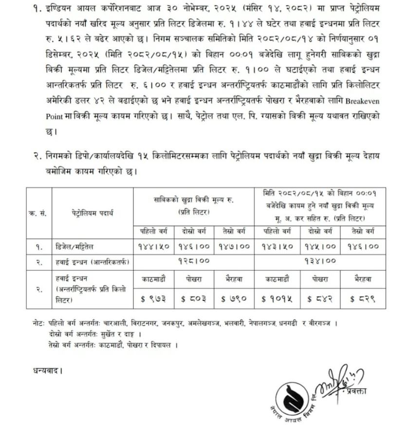 मंसिर १५ गतेदेखि मूल्य समायोजन गरी डिजेल र मट्टितेलको मूल्यमा एक रुपैयाँ घटाइएको छ भने हवाई इन्धनतर्फ ६ रुपैयाँ बढाइएको नेपाल आयल निगमले जनाएको छ ।