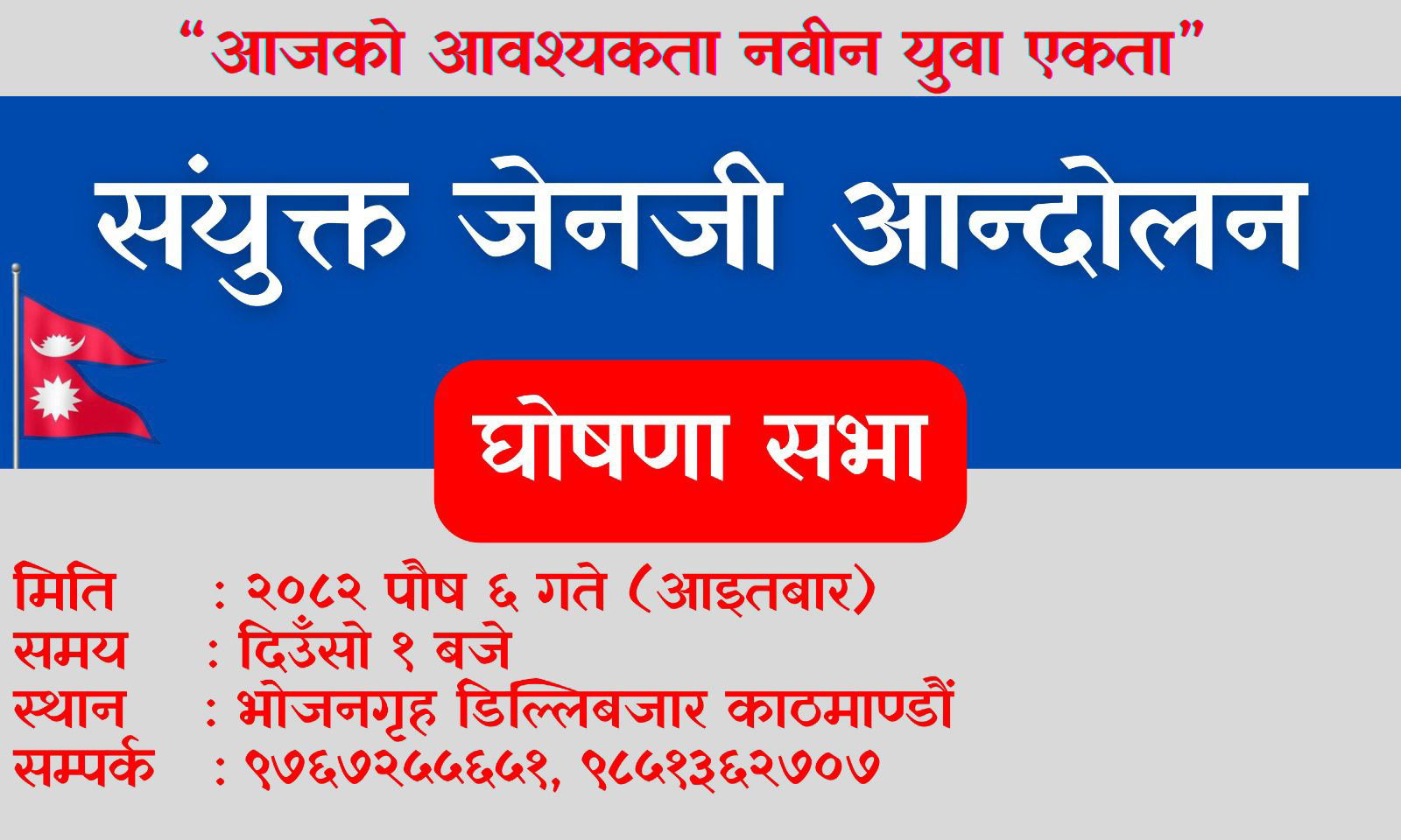 काठमाडौँ । जेन्जी आन्दोलनलाई संस्थागत गर्दै सरकारविरुद्ध संयुक्त संघर्ष अघि बढाउने निर्णयसहित ३० भन्दा बढी जेन्जी समूहहरूको संयुक्त बैठकले संयुक्त जेन्जी आन्दोलनको घोषणा गरेको छ। २०८२ साल पौष ५ गते ललितपुरको झम्सिखेलमा सम्पन्न उक्त बैठकले हालसम्म छरिएर रहेका जेन्जी समूहहरूलाई एउटै छातामुनि ल्याउँदै संयुक्त आन्दोलनलाई औपचारिक रूप दिएको हो।
